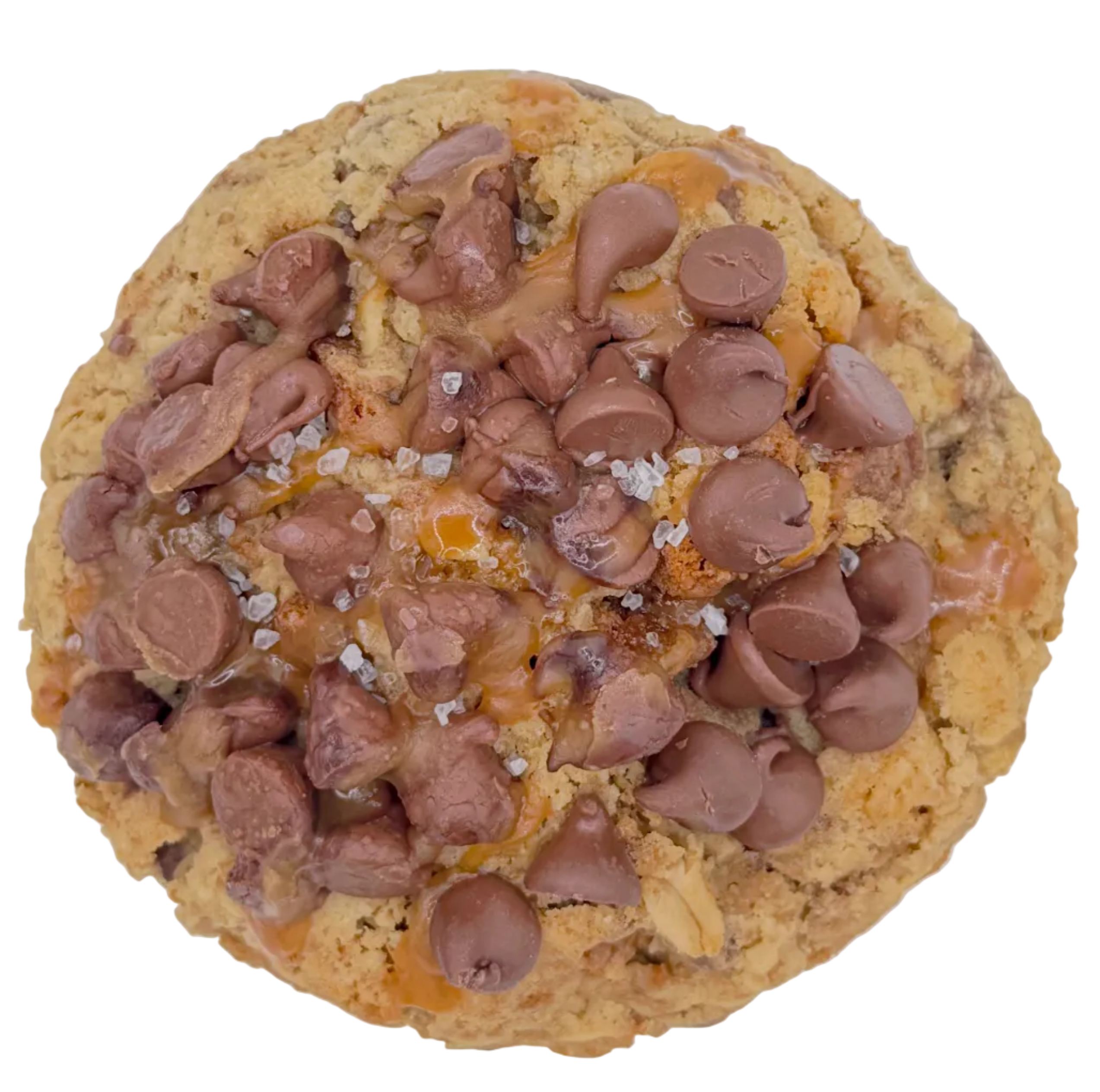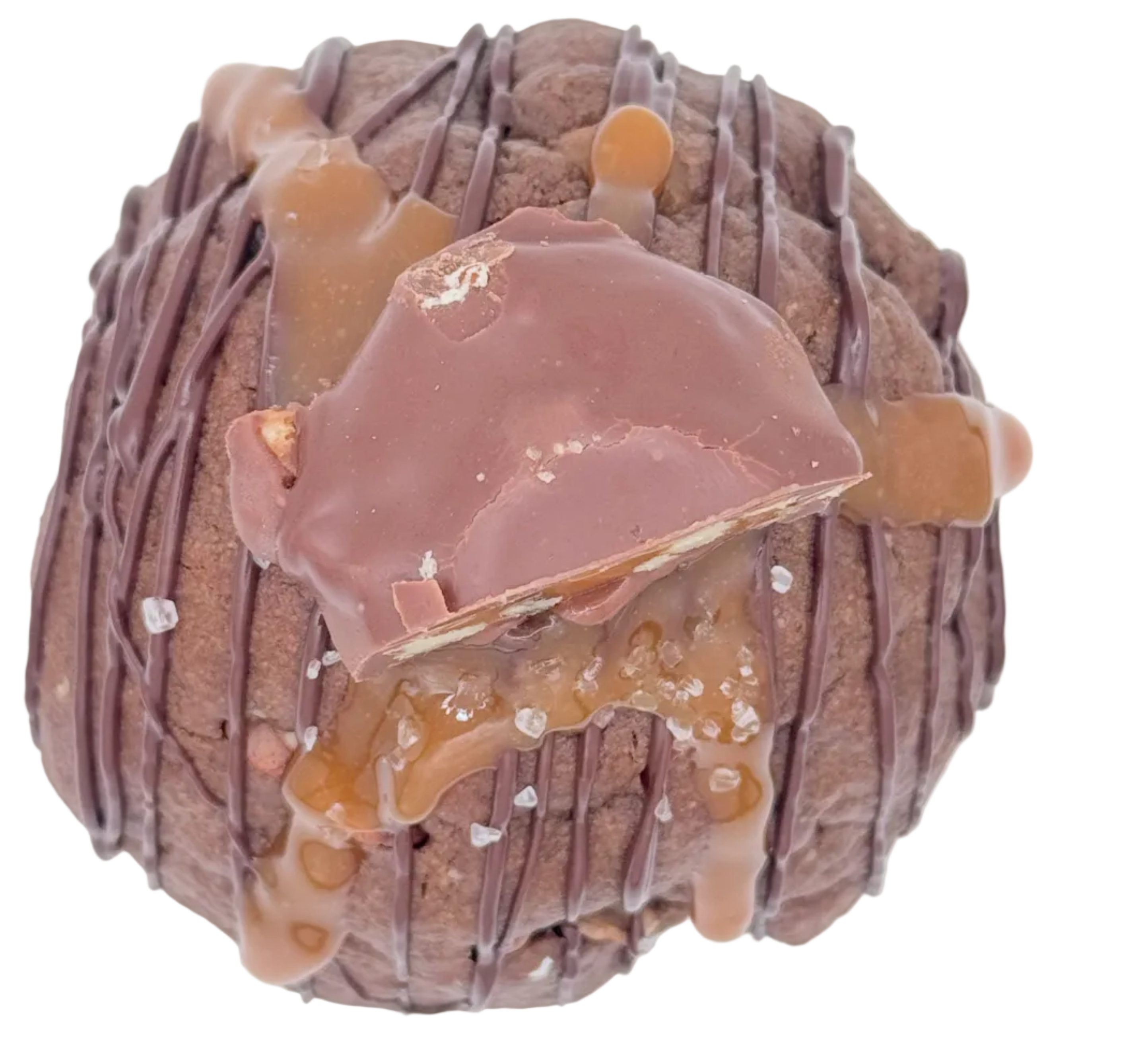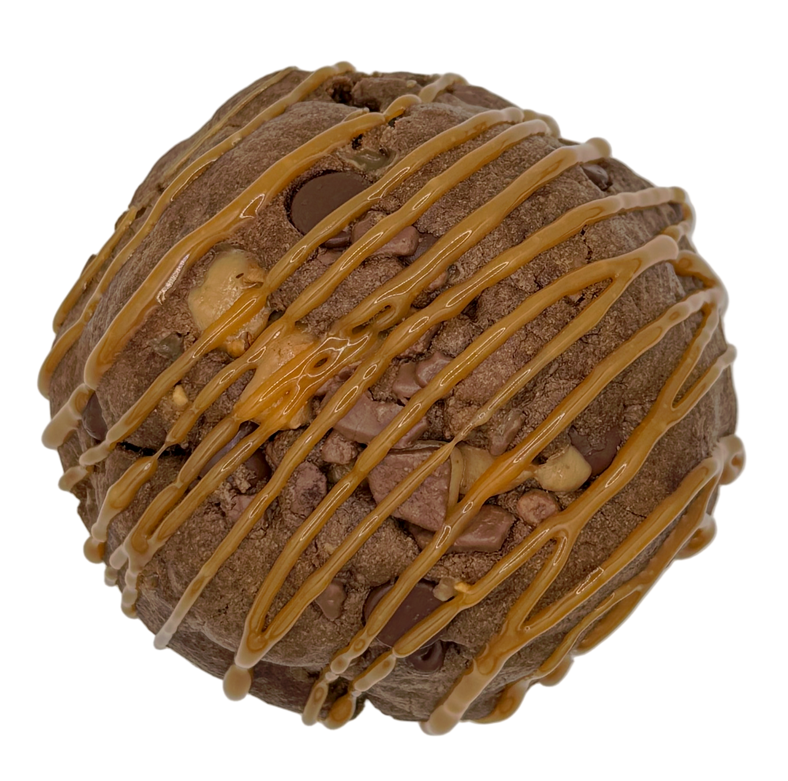 We took our signature chocolate dough and absolutely wrecked it with milk chocolate chips, molten caramel bits, and crunchy pecans until the structural integrity was questionable at best. Then we went full chaos mode: dark chocolate drizzle, caramel drizzle, double drizzle, no regrets. On top? A mini turtle, sitting there like it didn’t just witness a felony. Finished with a hit of sea salt because even disasters need balance.