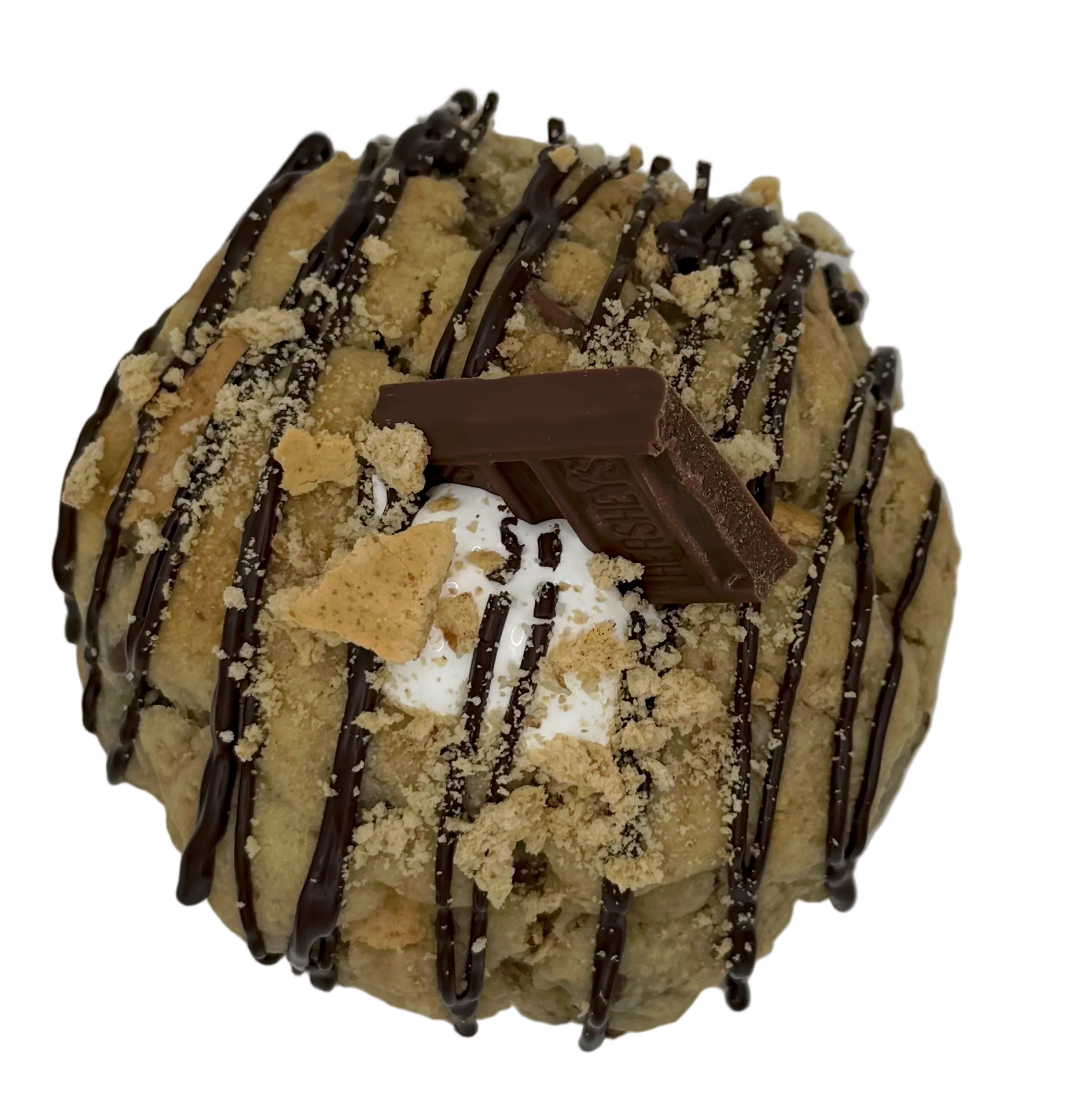 Inside? A gooey marshmallow fluff center just waiting to explode. Loaded with melty chocolate chips and sealed with a dark chocolate drizzle that definitely knows what it’s doing. Pitch responsibly.