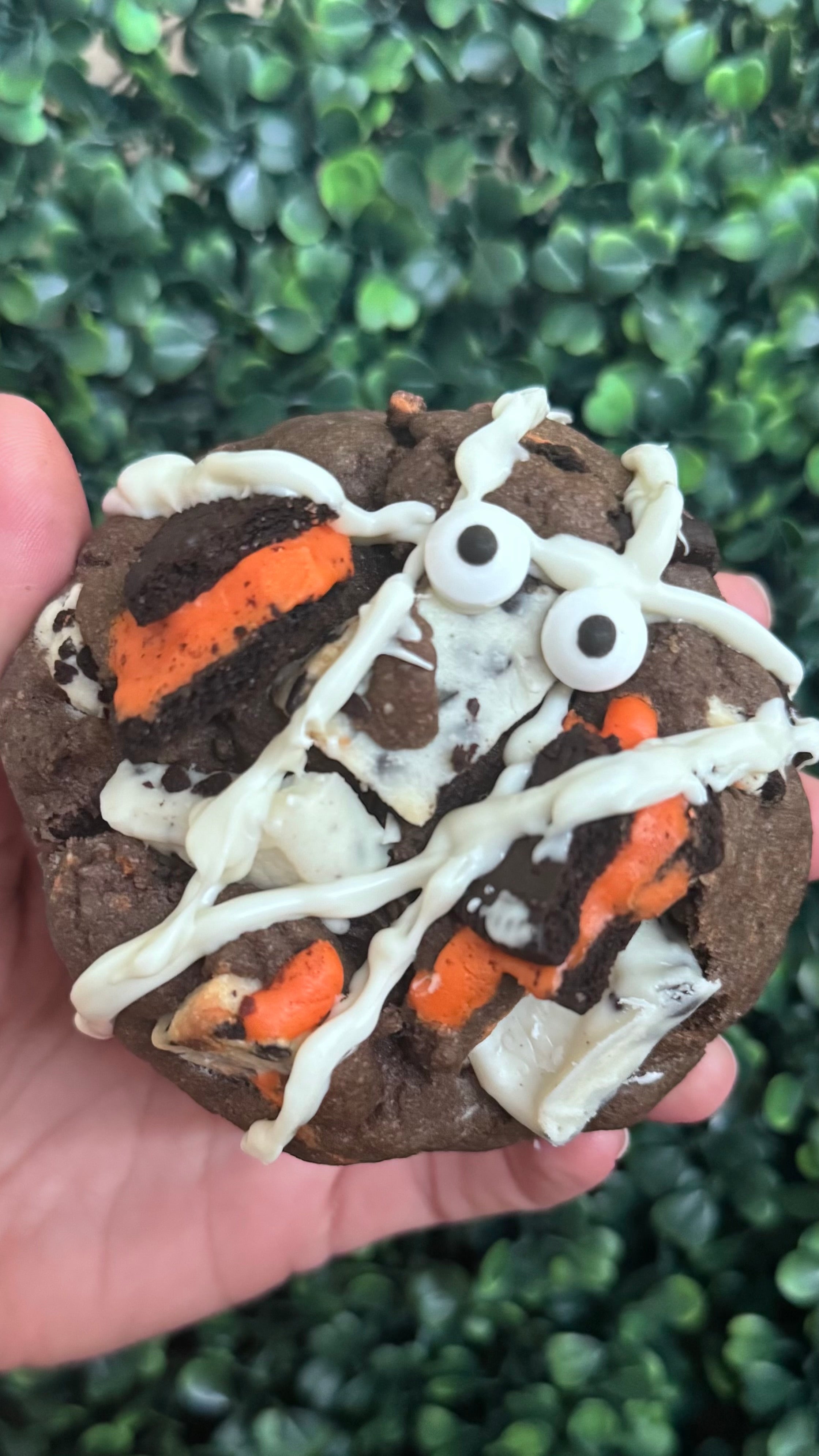 They say you can't cheat death... but you can eat it. The Cream Reaper is a sinful chocolate cookie stuffed with Halloween Oreo's and Cookies & Cream bars, then finished with white chocolate and candy eyeballs that stare deep into your soul while you take that first bite. It's dark, rich, and dangerously addictive. One bite and you'll be begging for mercy (and milk).