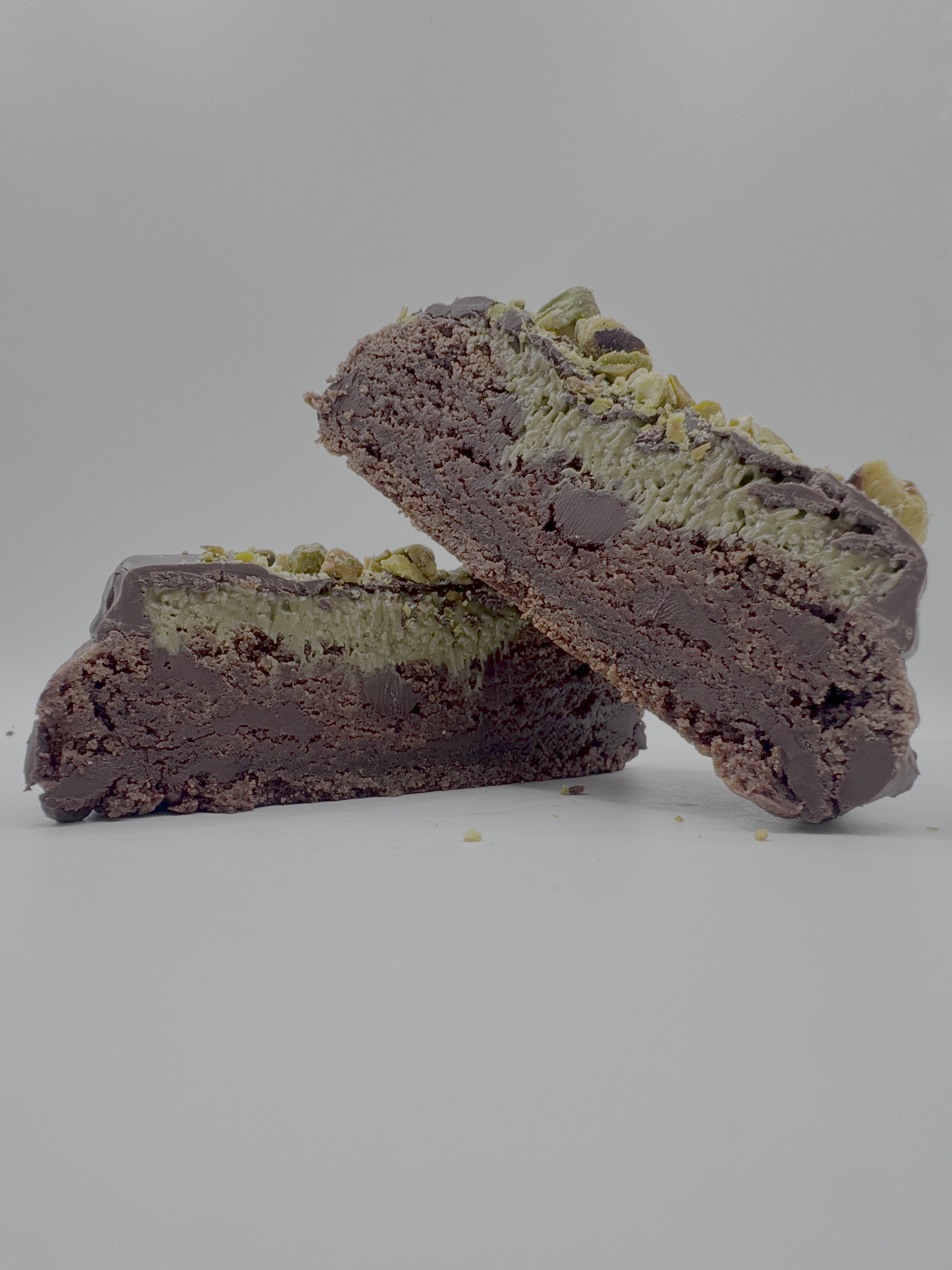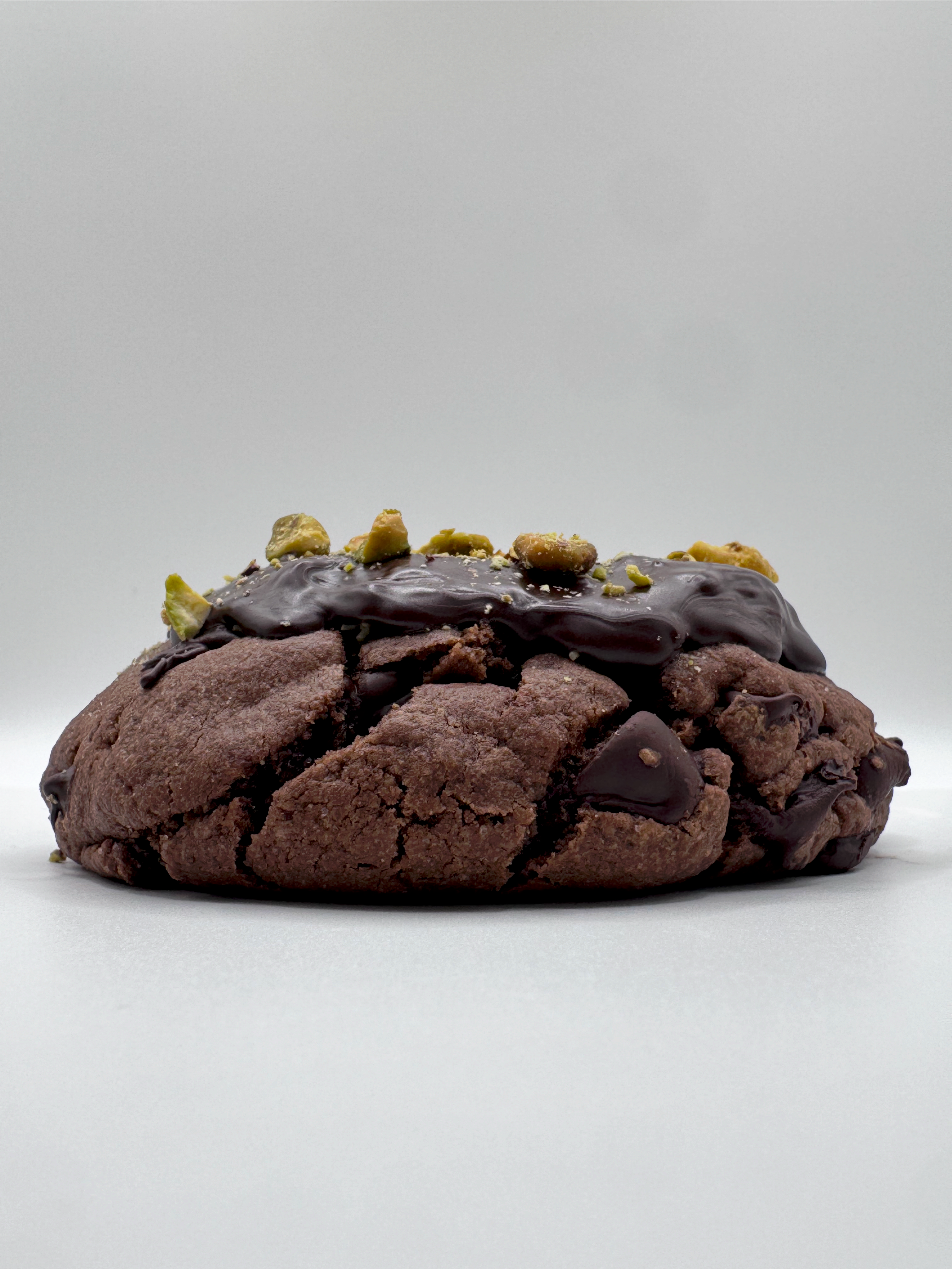Dark chocolate chips buried in rich chocolate dough, layered with crunchy, buttery pistachio kataifi, topped with molten dark chocolate, and dusted with crushed pistachios for that extra flex. Basically, it’s the edible version of a rooftop infinity pool at 2 AM — decadent, a little dangerous, and fully unnecessary… but we don’t care.